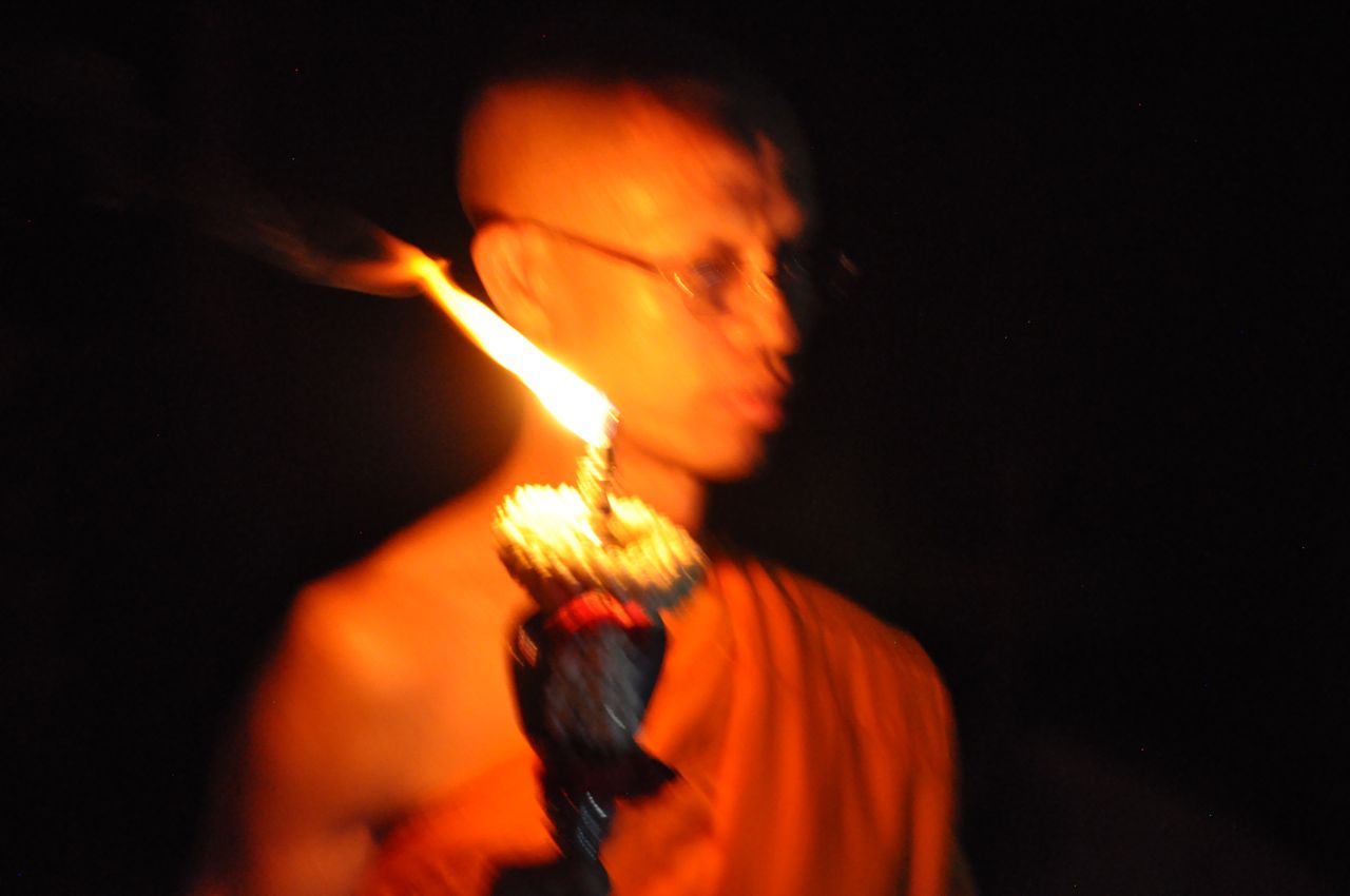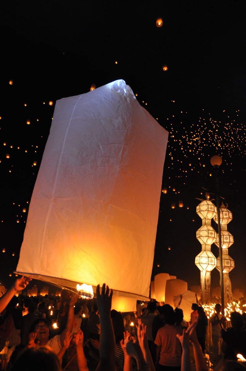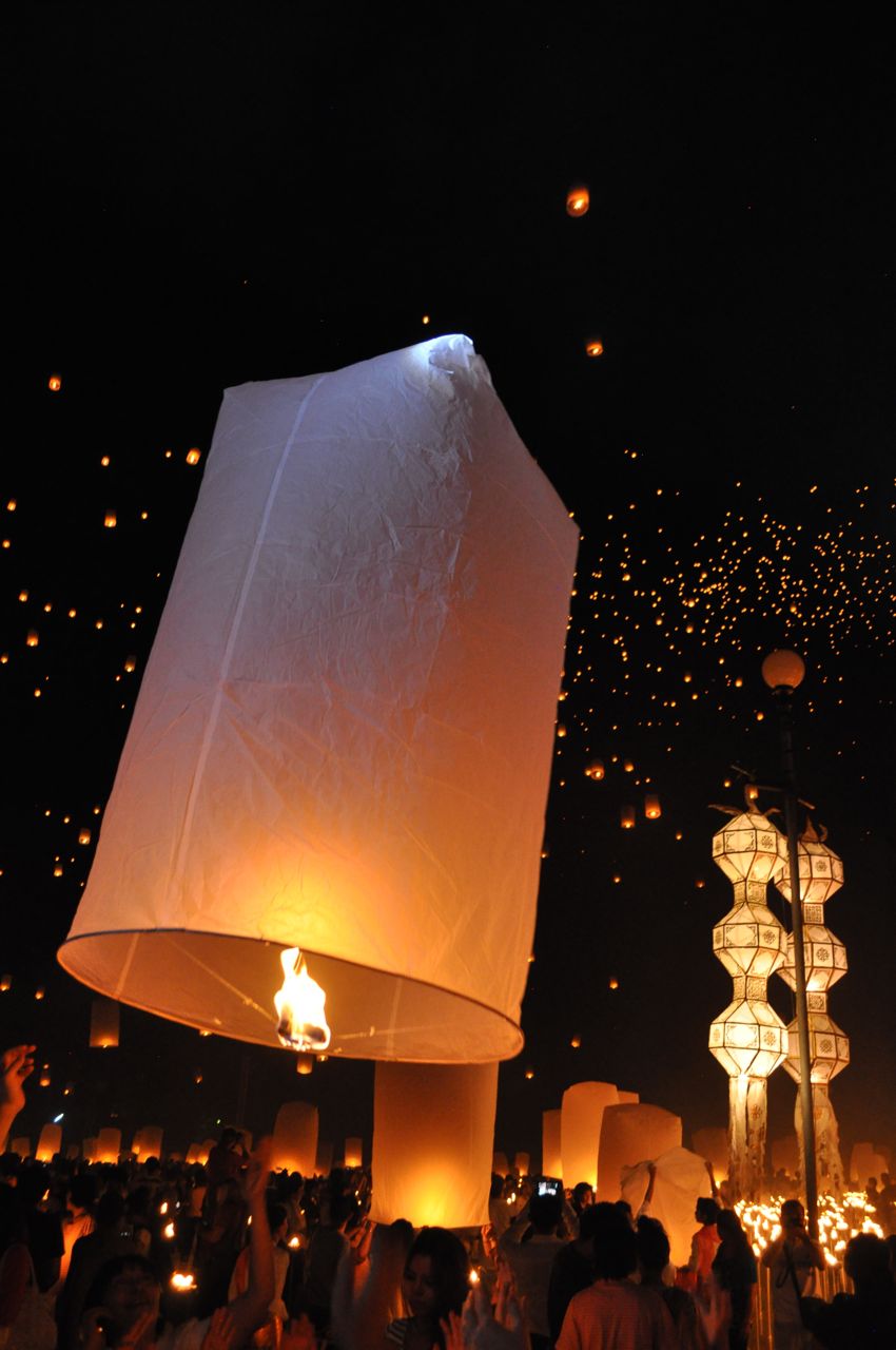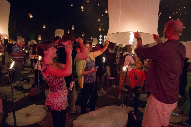 In simple terms, Loy Krathong is observed to show gratitude and respect, release sadness and burdens, and to be joyful.  The ceremony commences with prayer by monks, who then circumambulate the grounds as they chant.  It is a time in the ceremony of great reverance and peace.  Torches throughout the grounds are then lit, upon which the lanterns are ignited.  The lanterns are about 4-feet tall when fully inflated, and it takes a few minutes for the heat of the flame to fill the lantern with hot air sufficient to carry it skyward.