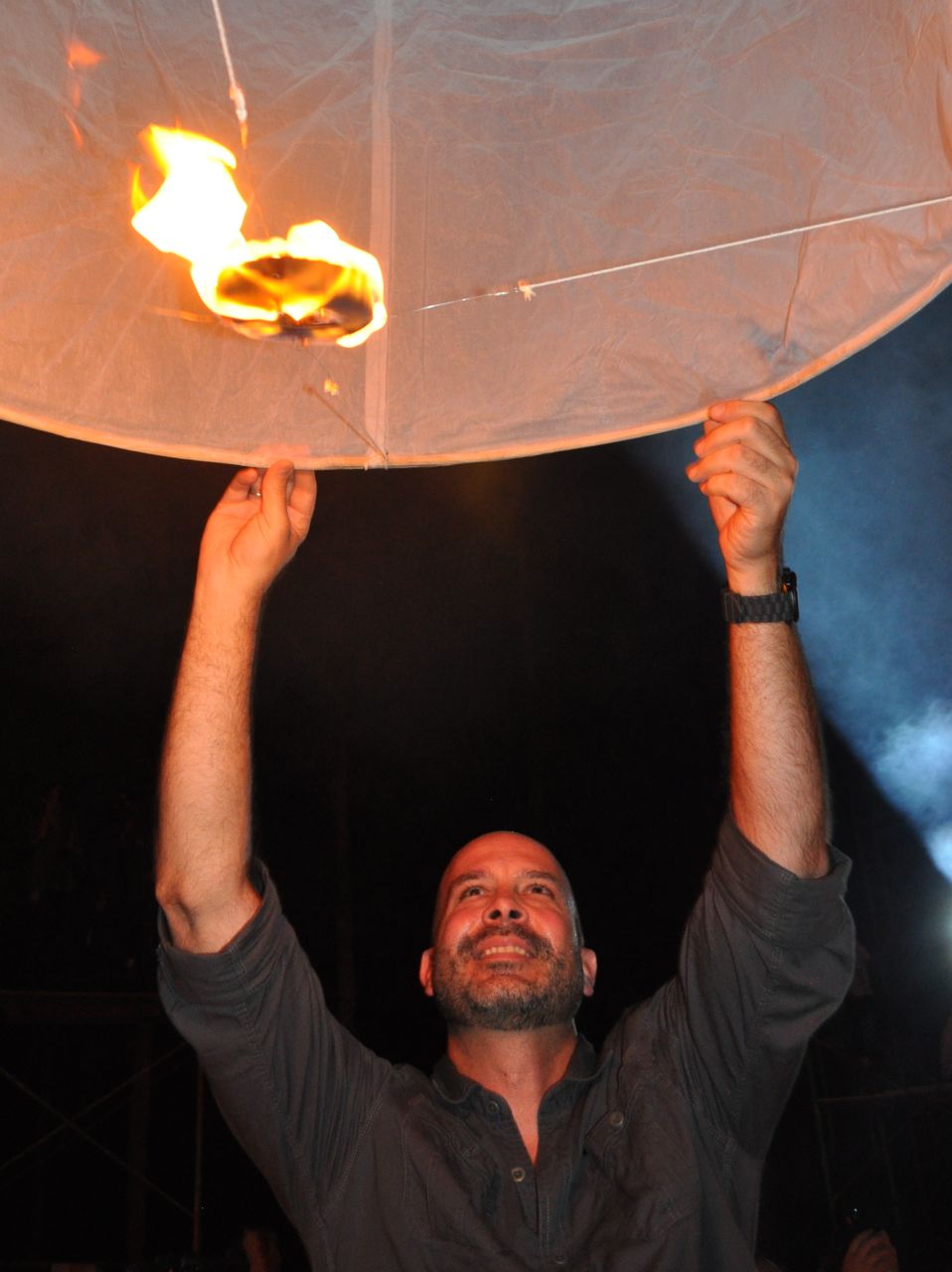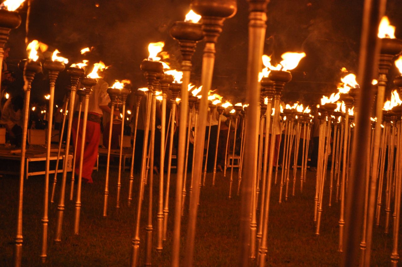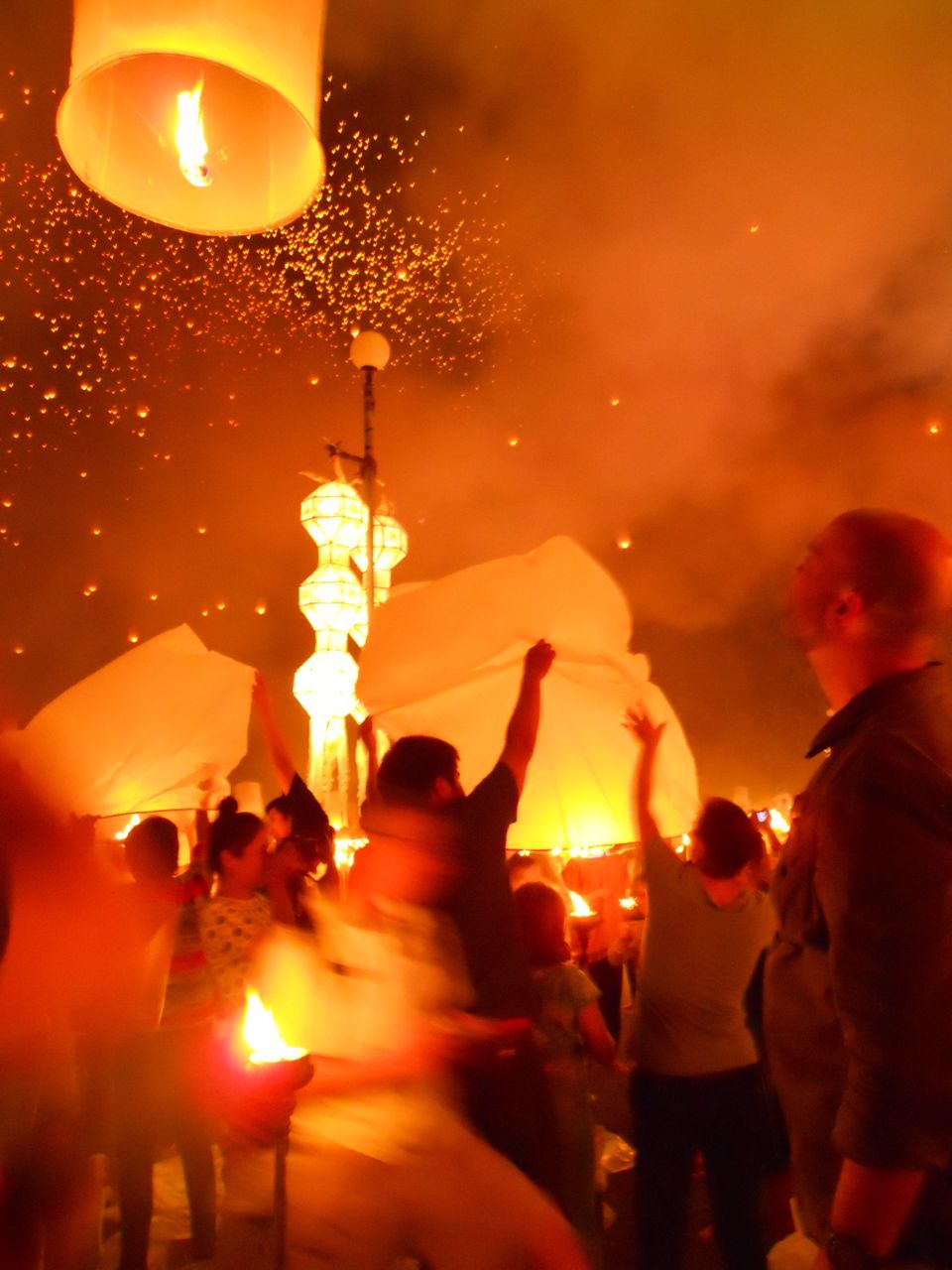 In simple terms, Loy Krathong is observed to show gratitude and respect, release sadness and burdens, and to be joyful.  The ceremony commences with prayer by monks, who then circumambulate the grounds as they chant.  It is a time in the ceremony of great reverance and peace.  Torches throughout the grounds are then lit, upon which the lanterns are ignited.  The lanterns are about 4-feet tall when fully inflated, and it takes a few minutes for the heat of the flame to fill the lantern with hot air sufficient to carry it skyward.